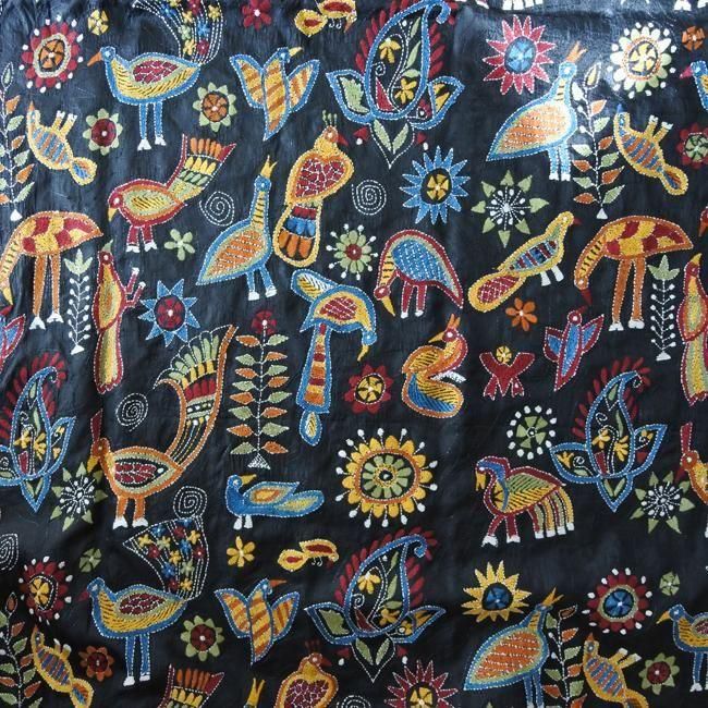 カンタ刺繍  大判ショール 花々と鳥たち ブラック